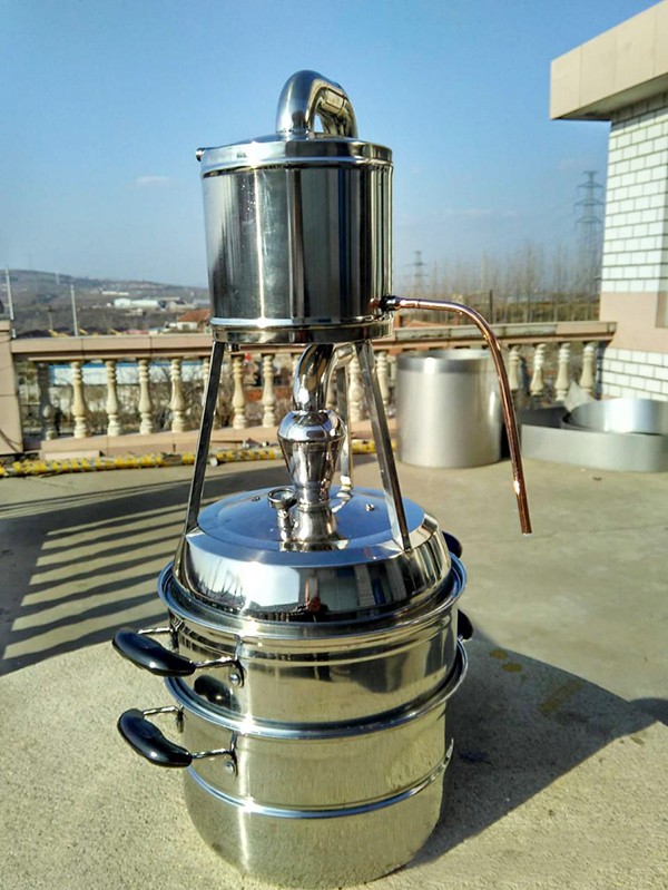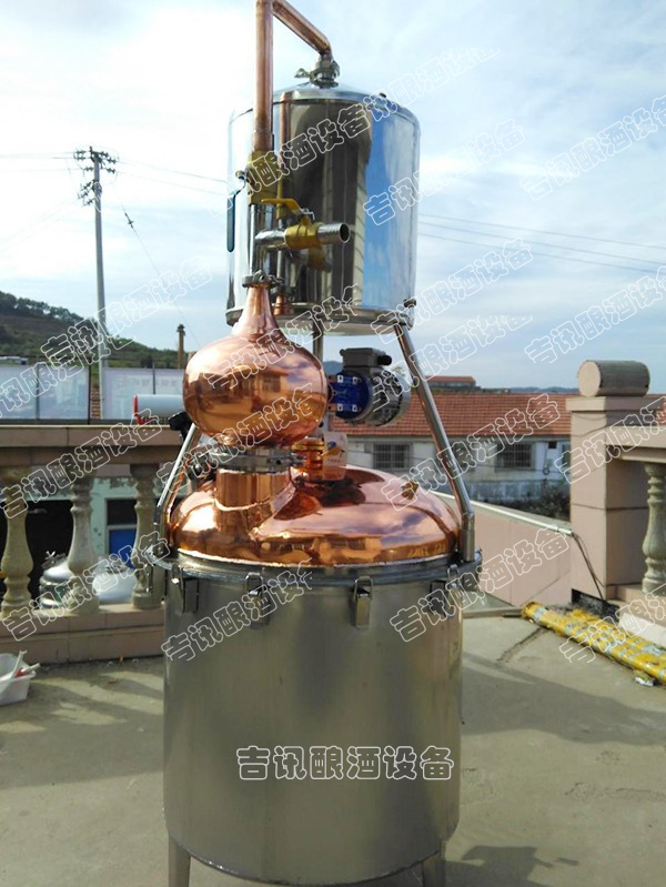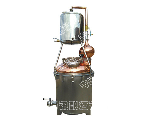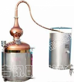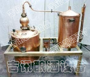 本機屬單次蒸餾機組,采用夏朗德蒸餾器與糧食酒蒸鍋部分優勢特色,酒汽聚集在上方的球形回流器中,產生少量回流提餾,經由延長拔高蒸汽導管或天鵝之頸,使雜質下沉與提餾,然后酒氣進入冷卻器,在冷卻器中冷凝出粗酒,原酒三四十度左右。把一次 出的原酒重新加入蒸餾器進行二次蒸餾,得到所需原酒,一般酒度為遞減過程。或者采取“切酒”方式取酒,蒸餾時的蒸汽,酒精濃度高,稱為“酒頭”,要和其他的分離,隨后獲得的是“酒心”,它是清澈透明的烈酒,取其酒心,然后低度酒混入發酵液或收集做二次蒸餾。